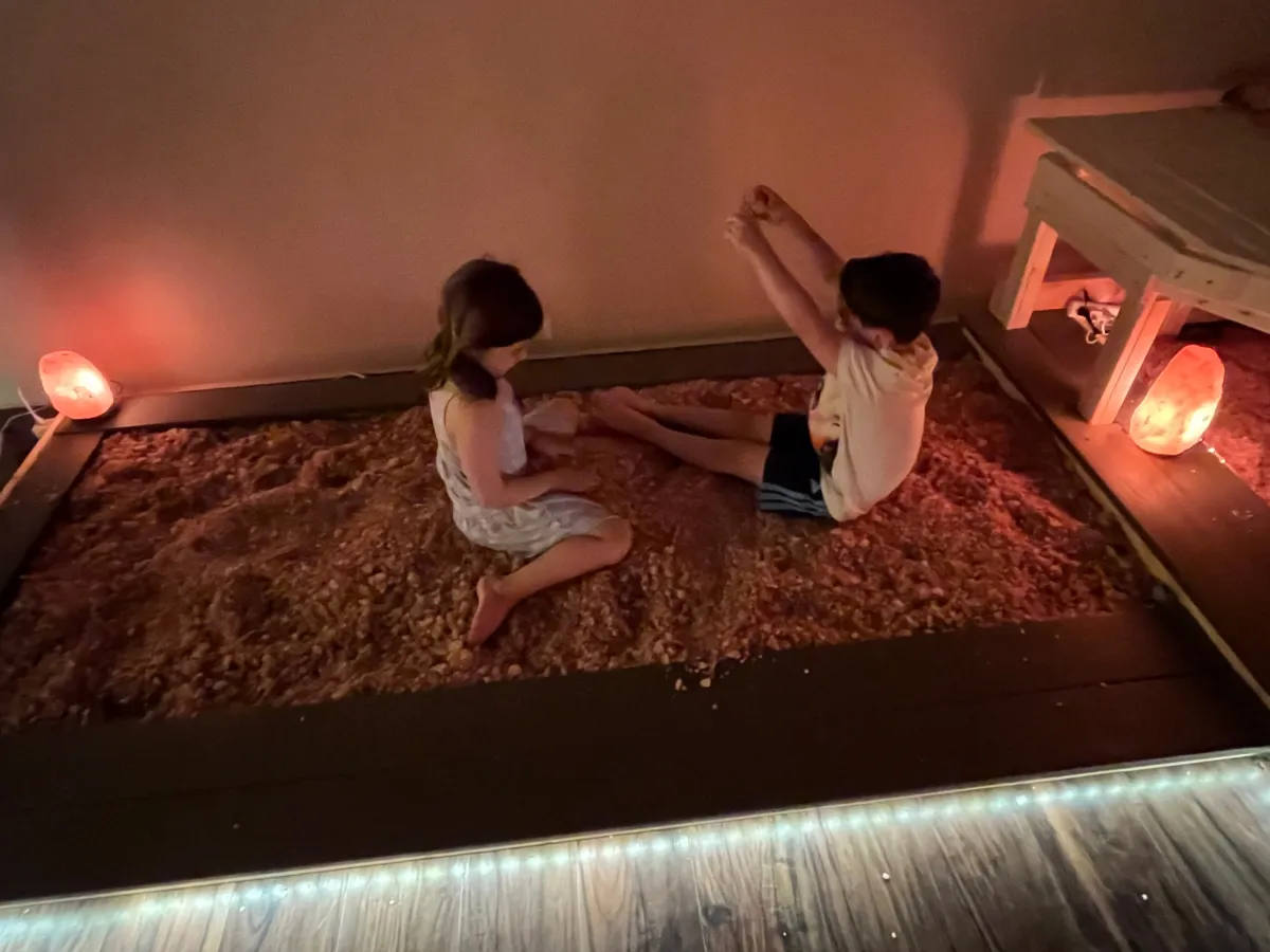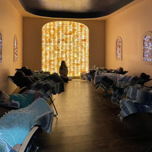 You’ll sit comfortably in a softly lit room while the air fills with microscopic salt particles.